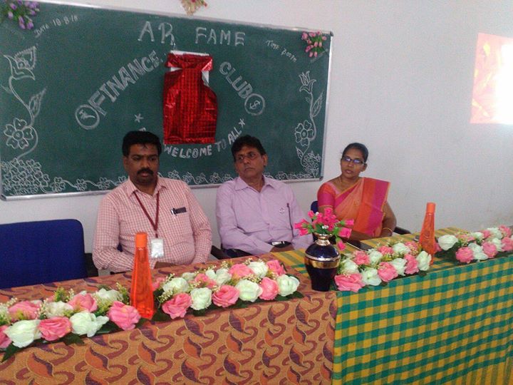 FAME (Professional Club of AR School of Business) organised logo release ceremony. Mr. Subramaniyan Ram (Retired officer - IOB) and Mrs. Abidha Rajeev (NIIT - Centre Head) released the logo and delivered the guest lecture on Job Opportiunities in Banking Industry.